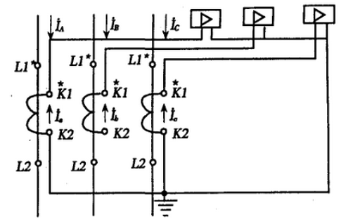 三相式完全星形接線方式如圖所示,這種方式對各種故障都起作用。當故障電流相同時,對所有故障都同樣靈敏,對相同短路動作可靠,至少有兩個繼電器動作,因此主要用于高壓大電流接地系統(tǒng)以及大型變壓器、電動機的差動保護、相間短路保護和單相接地短路保護和負荷一般不平衡的三相四線制系統(tǒng),也用在負荷可能不平衡的三相三線制系統(tǒng)中,作三相電流、電能測量